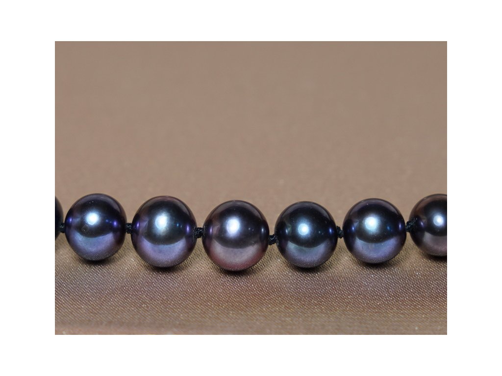 Igazi fekete tenyésztett édesvízi gyöngy nyaklánc, 7,5–8,5 mm-es gyöngyökkel.