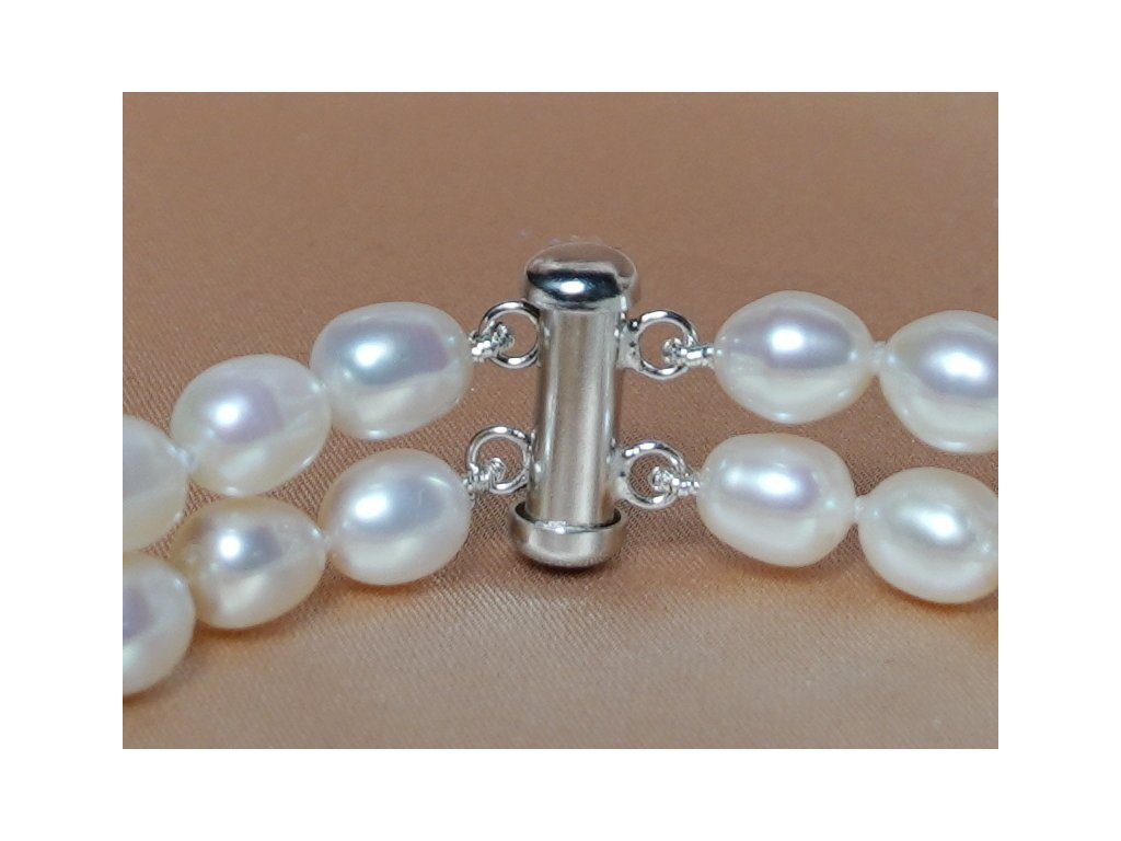 A DOSB06AA+wJ cikkszámú két soros gyöngyös karkötő két sor fehér édesvízi, hosszúkás gyöngyből készült, mérete kb. 6 x 8 mm, AA+ minőségű, sima felületű és nagyon magas fényű. A gyöngyökön apró természetes hibák előfordulhatnak.