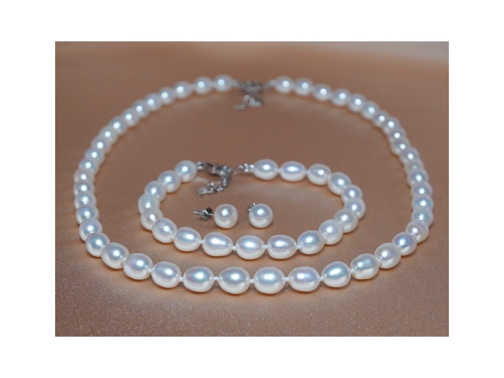 A szettben fehér, hosszúkás édesvízi gyöngyöket használtunk, méretük 6–6,5 mm, minőségük AA+ (fény AAA, felület AAA, forma AA).