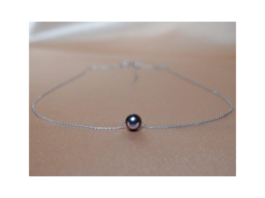 Igazi fekete tenyésztett édesvízi gyöngy fehérarany láncon – FPN095AAAwB. Ez az elegáns nyaklánc egy valódi, kerek fekete édesvízi gyöngyből készült, AAA minőségben, 14 karátos (585/1000) fehérarany láncra fűzve (AUCHP05).